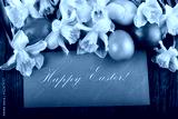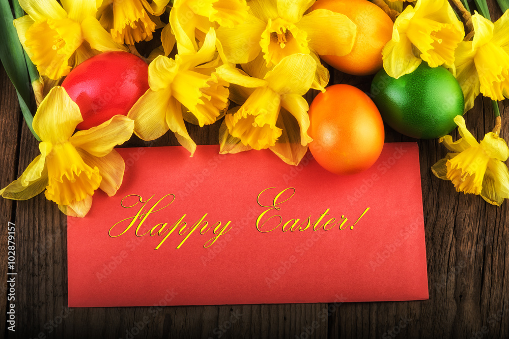 Easter decoration with spring flowers on dark wooden board. Text Happy Easter