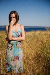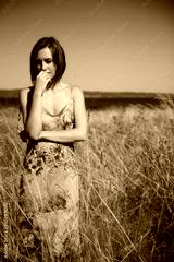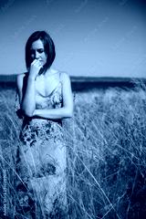 A sad beatiful caucasian girl in the middle of a grassy field