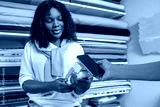 Shop assistant helps to shopper to complete purchase using contactless payment in fabric store