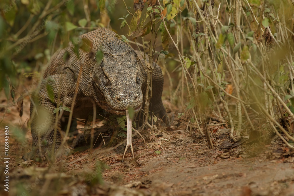 Komodo dragon walking ahead on komodo island in Indonesia / Komodo dragon walking ahead on komodo island in Indonesia