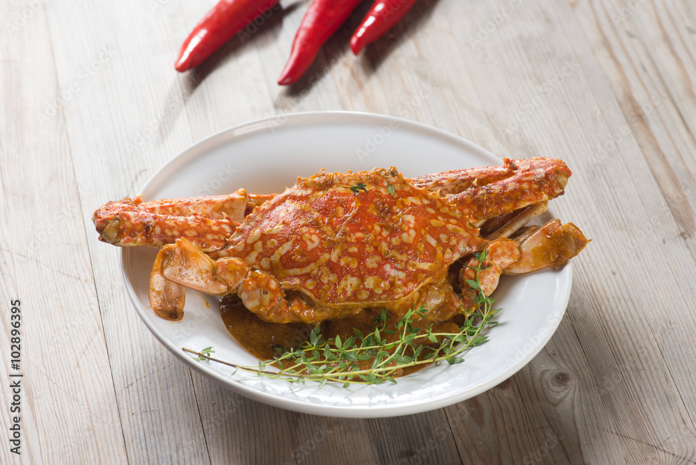 Stirred Fried Crab with Garlic, Pepper, Curry Powder.