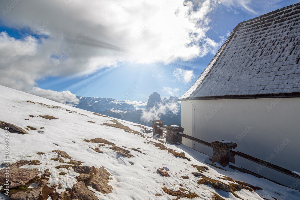 Verschneite Landschaft mit Haus und Sonnenschein über den Bergen