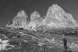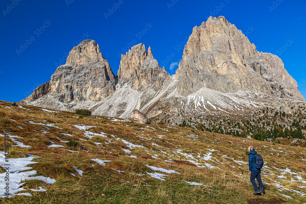 Ein Mensch wandert auf einer Bergwiese mit schneebedeckten Gipfeln am Sellajoch der Sellagruppe unter klarem Himmel, Südtirol, Italien