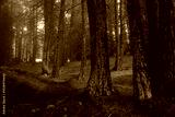 Dichter Wald mit nebligen Bäumen und einem weichen Lichtstrahl, der den Pfad erhellt