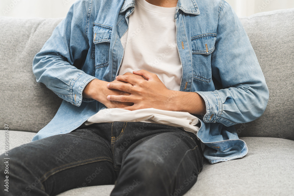 Flatulence ulcer, hurt suffer asian young man, male hand in belly, stomach pain, ache from food poisoning, abdominal and digestive problem, gastritis or diarrhoea. Abdomen inflammation problem person.