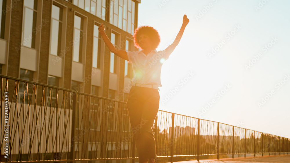 African American happy carefree joyful businesswoman dancing walking in city sun sunshine ethnic cheerful girl female business woman dance walk go outdoors urban celebrate good mood having fun music
