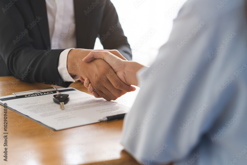 Business car rental, sell service, dealership hand of agent dealer asian young male, man handshake with customer renter, woman buyer receiving, client or tenant, transfer automobile, finance concept.