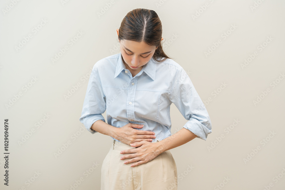 Flatulence asian young woman intolerance hand in stomach ache, suffer from food poisoning, abdominal pain and colon problem, gastritis or diarrhoea when at home. Patient belly, abdomen or inflammation
