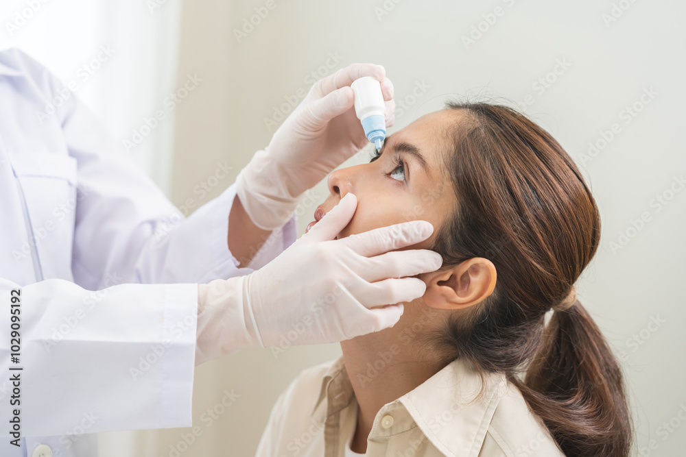 Health care concept, eye doctor eye drops to asian young woman patient, hand using medical eye drop to treat dry eye, suffering irritation or inflammation, allergy optical symptom at optic clinic.