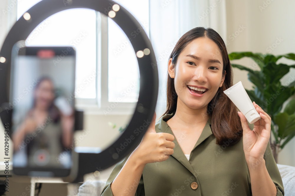 Influencer live internet, happy vlog asian young woman blogger using smart phone talking on video streaming podcast review online on social media, digital marketing with mobile content creator concept