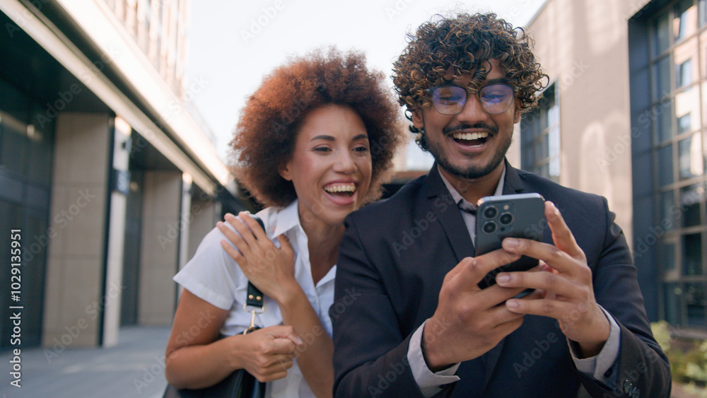 Multiracial business colleagues coworkers friends African businesswoman Arabian Indian businessman walking in city with mobile phone win success high five gesture achieve online good result happy