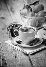 Hot coffee in cup breakfast and cake