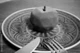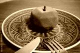 Sweet dessert in the form of a yellow green apple on round grey plate. Sweet treat in a pastry shop, cafeteria. Baked cake and utensils. Pastry sweets