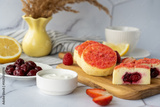 Delicious cheesecake with cherry filling and fresh berries served with sour cream and coffee in a cozy kitchen setting. Concept of homemade dessert, breakfast, and healthy eating.