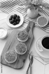 Mini cheesecakes with cherry filling and strawberry topping on a wooden board, served with coffee and sour cream in a cozy kitchen setting. Homemade dessert, comfort food, and breakfast sweets.