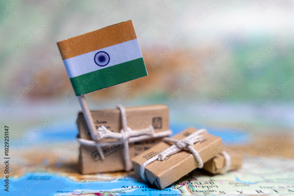 Flag of India near the parcels on the world map. World trade. Exports and imports of goods. Economy of the country
