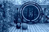 mini trampoline for fitness exercising and rebounding, slam ball and iron kettlebell in a backyard