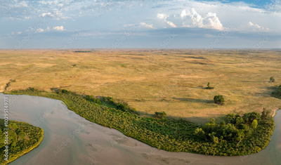aerial panorama of the Dismal River and Nebraska Sandhills at Nebraska National Forest, late summer morning scenery