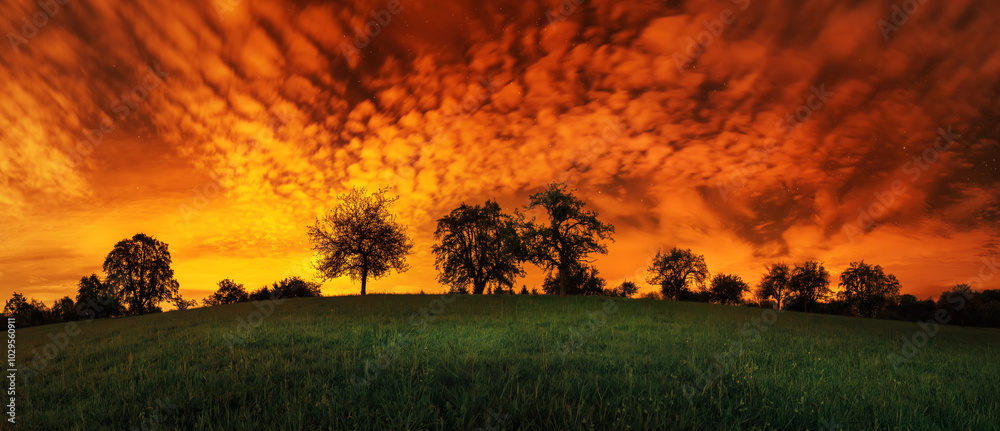 Silhouettes of a row of trees on the horizon, dramatic sky