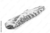 Raw pork ribs with basil leaves and cherry tomatoes, isolated on white background.