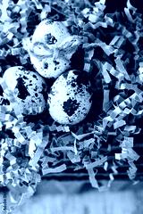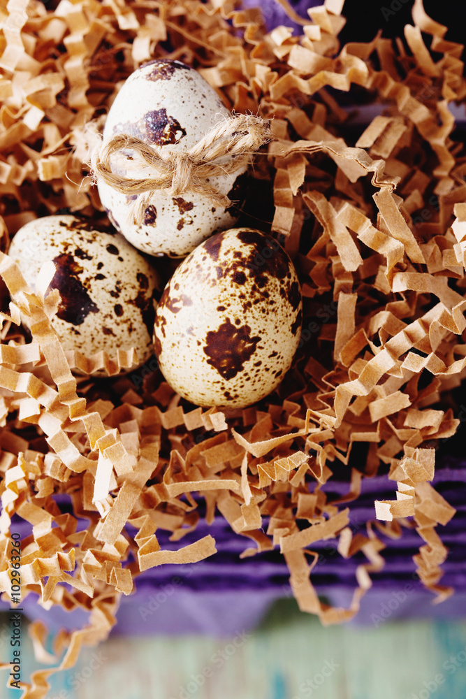 Happy Easter vintage and natural style postcard. Quails eggs in basket over old wooden background