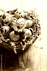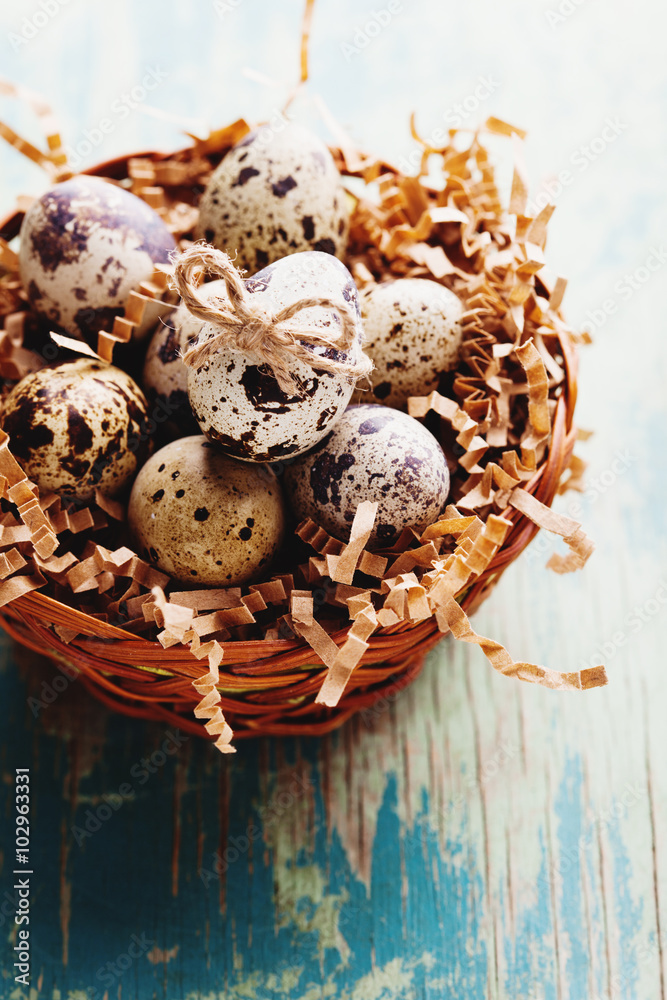 Happy Easter vintage and natural style postcard. Quails eggs in basket over old wooden background