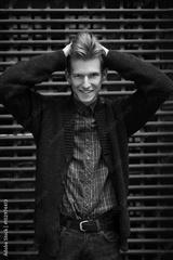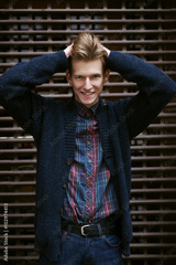 Street fashion portrait of a young handsome smiling man holding his hair. Model wearing stylish casual clothes. City lifestyle. Male fashion, street style concept.