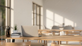 A laptop on a wooden table in a minimalist Scandinavian coffee shop co-working space or library.