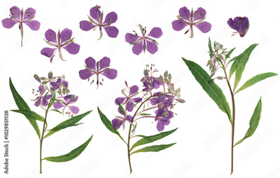 Pressed and dried delicate purple flowers fireweed or willow-herb (epilobium), isolated on white background. For use in scrapbooking, floristry or herbarium.