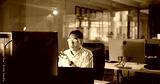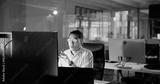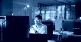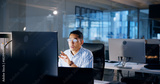 Research, night and computer with business man in office for profit margin report, client review and advisory. Corporate, stakeholder proposal and online with person for investment portfolio