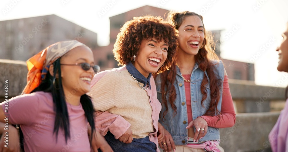 Friends, talking and gen z outdoor for fashion, bonding and communication with trendy cool outfit. Girls, happy and laugh for community, gossip and diversity with streetwear, culture and retro style