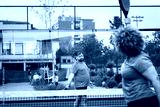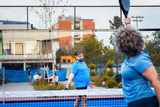 Mixed adult couple playing padel on outdoor court.