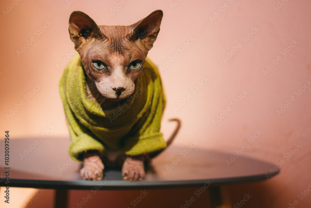 A hairless Canadian Sphynx cat dressed in a green sweater is sitting on a table. Portrait of a cat in a home interior. Sphinx kitty with emerald eyes.
