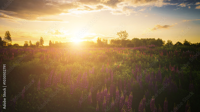 Sunrise or sunset on a field with purple lupines on a cloudy sky background in summer. Vintage film aesthetic.