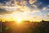 Sunrise or sunset on a field with purple lupines on a cloudy sky background in summer. Vintage film aesthetic.