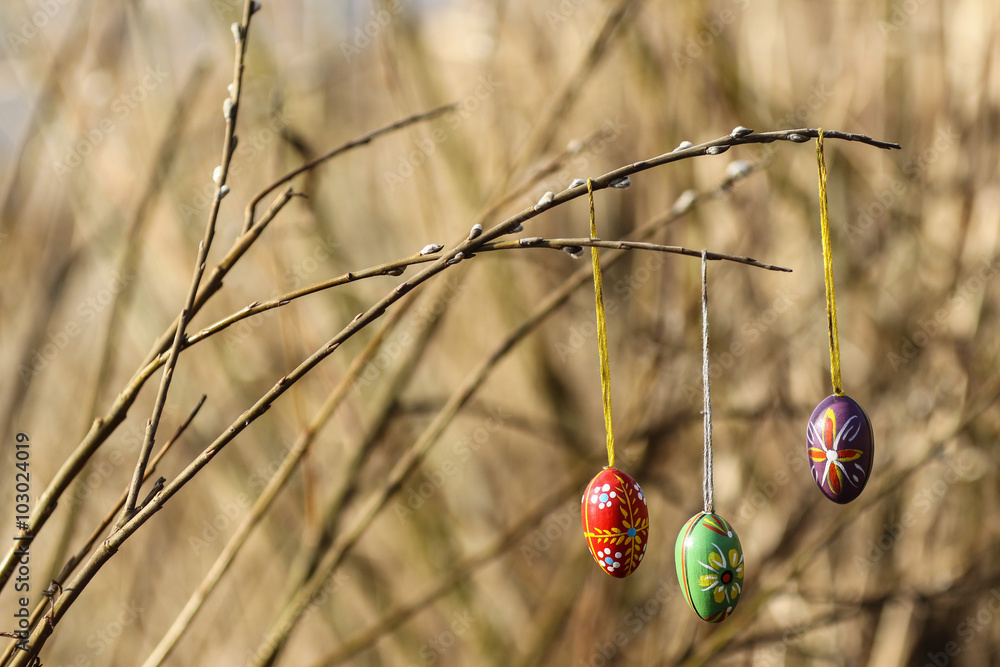 Three colorful Easter eggs hanging on the willow twig with catkins