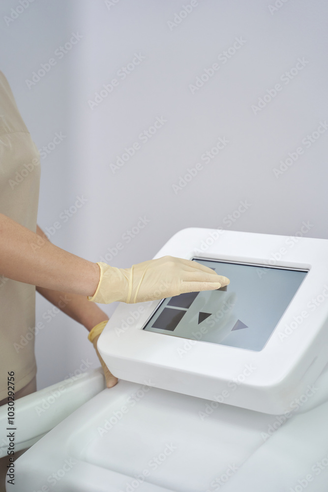 Person operating touchscreen on medical equipment in clinical setting with gloves for hygiene and safety.
