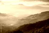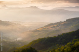 Serene landscape of Tara valley at sunrise, with fog rolling over the mountains and soft sunlight illuminating the scenery, perfect for nature lovers and travelers.