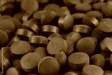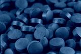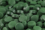 Green spirulina tablets arranged closely on a surface in natural light