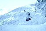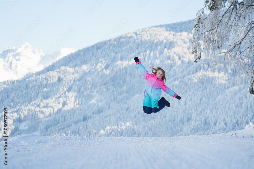 Happy girl on winter vacation jump high.