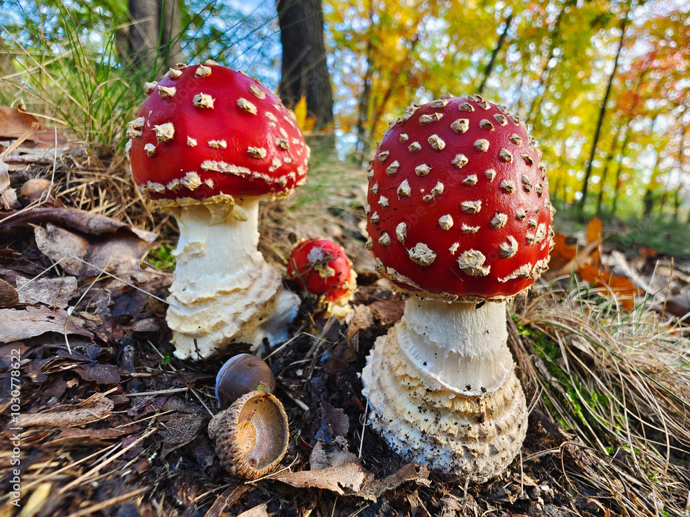 Red toadstool beautiful autumn mushroom in the forest.