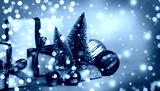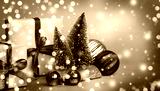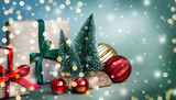 Christmas trees, red and gold balls, gift boxes in craft paper with red and green ribbon on a green background.