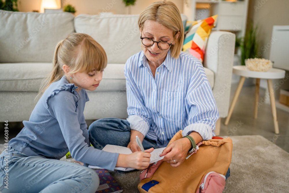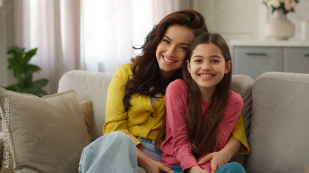 Happy cheerful family portrait Caucasian smiling single mother woman female mom hugging embrace little girl kid daughter looking at camera resting together inside apartment. Parent and child bonding