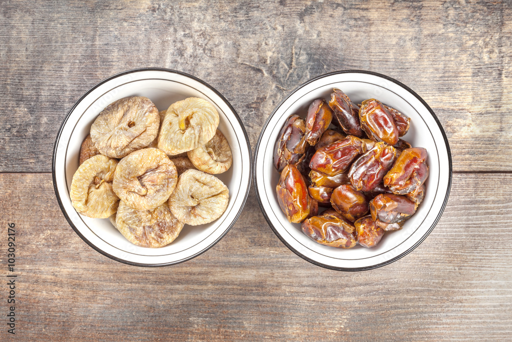 Dried figs and dates in bowls on wooden background