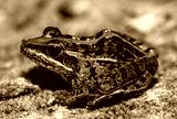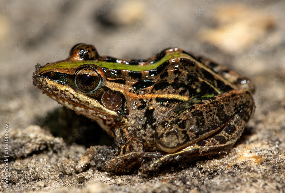 A beautiful Mascarene Grass Frog (Ptychadena mascareniensis), also known as the Mascarene Ridged Frog, near a pond in Liuwa Plain National Park, Zambia