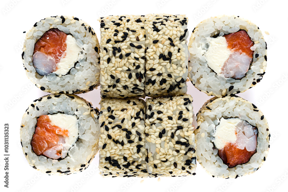 Set of sushi rolls with shrimp, salmon, cream cheese in sesame seeds isolated on white.