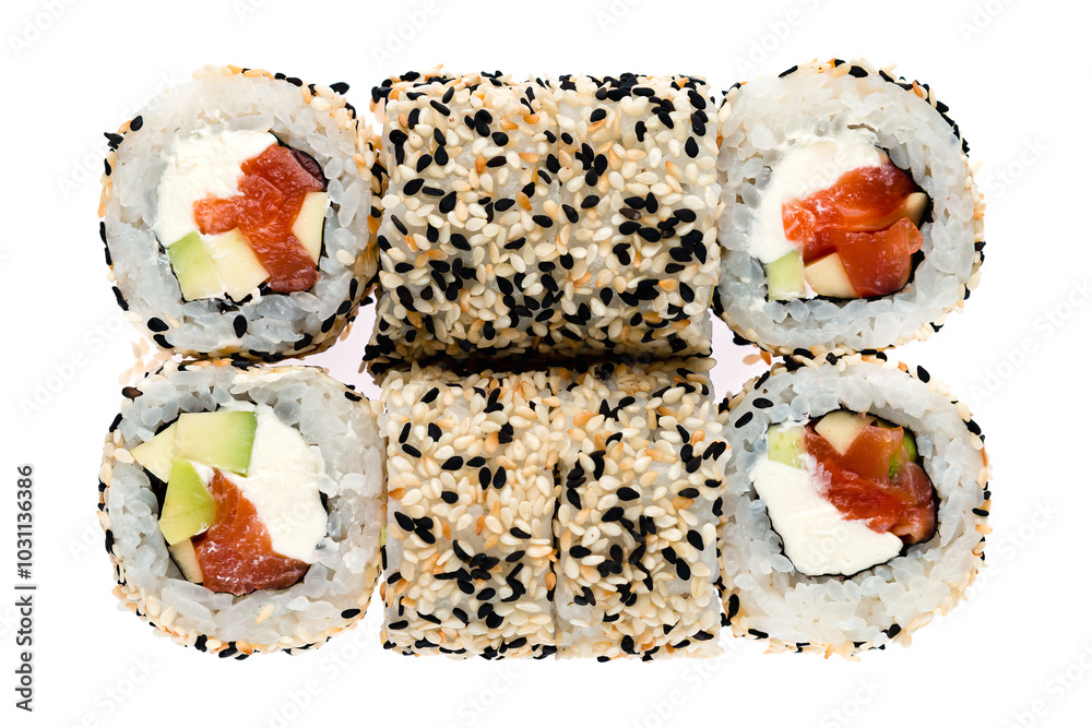Set of sushi rolls with salmon, cream cheese, avocado in sesame seeds isolated on white.