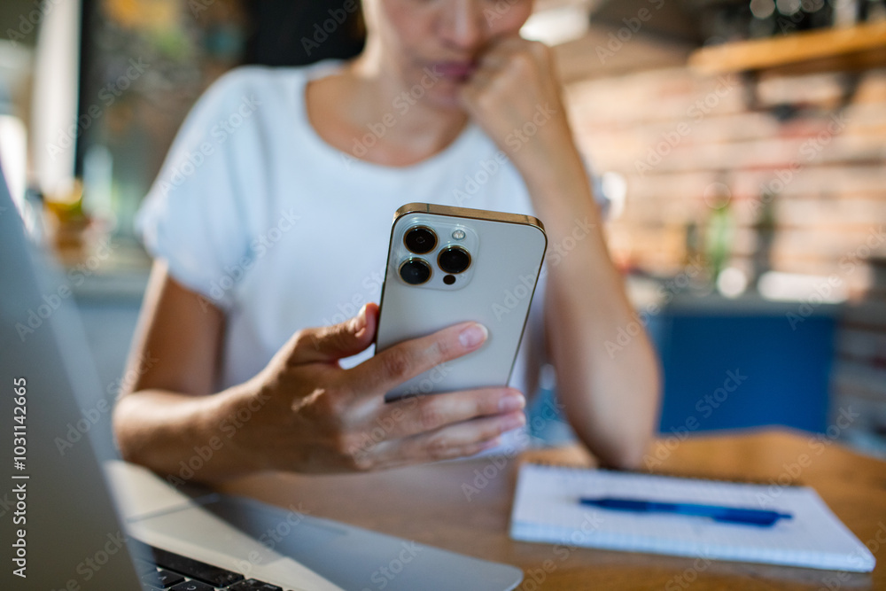 Woman working from home using smartphone and laptop in kitchen with healthy meal