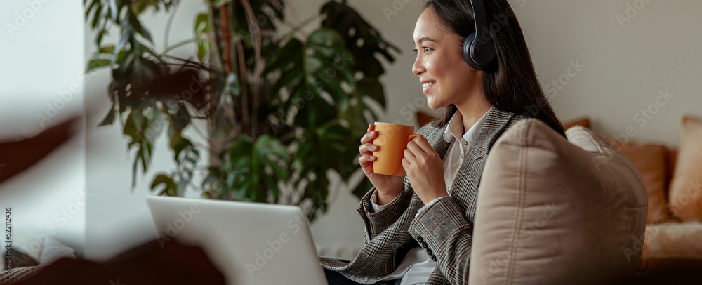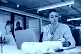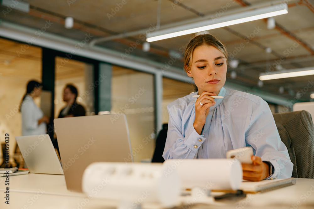 A young woman is actively engaging with her smartphone while situated in a contemporary office environment