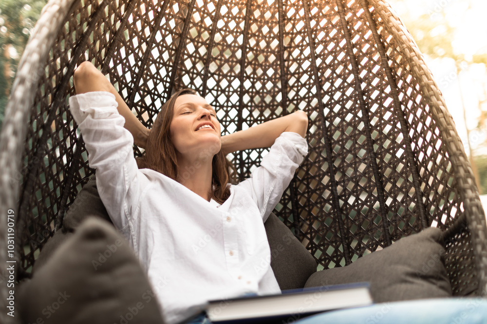 Young pretty woman relaxing closing her eyes sitting back relaxing in chair outdoors on porch. Happy positive beautiful lady feeling joy peace quiet enjoying weekend holiday, and warm sunshine